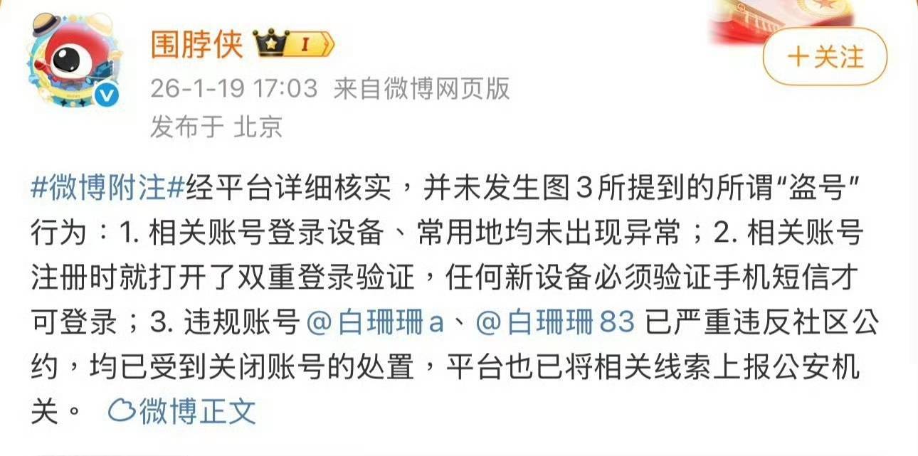 面对吴磊方强硬回应,她改口称"账号被盗",但微博官方核查后否认盗号可能,指出其账号登录设备无异常、双重验证未触发,违规行为属实。