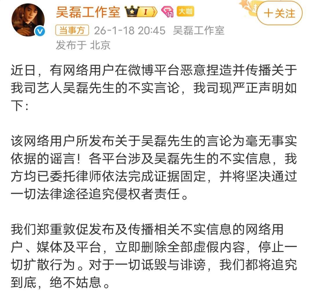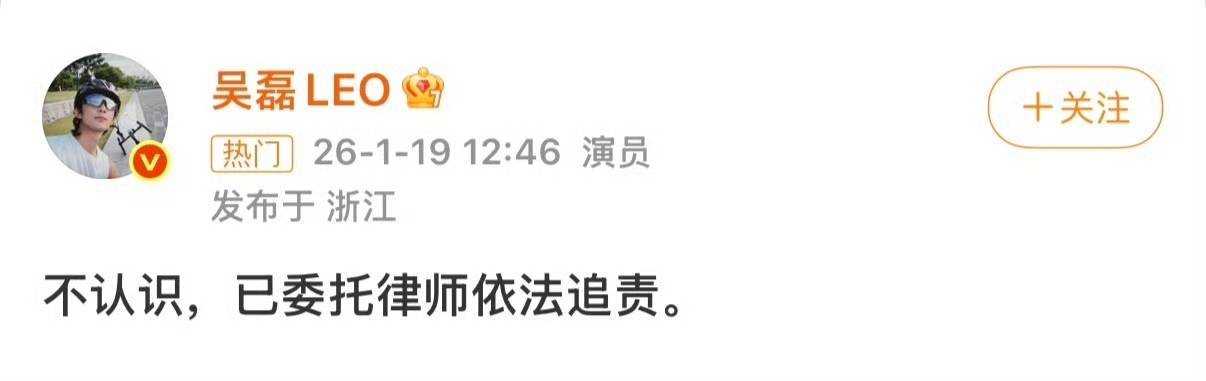 吴磊本人下场:19日12:46亲自发文七字定调——"不认识,已委托律师依法追责"